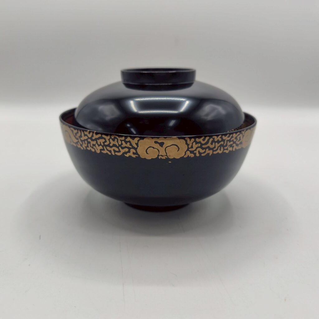 この椀の内側では、渦巻き状の捻子文様が放射状に展開し、各所に配された螺旋の意匠がアクセントとなっている。色彩の切り替えも巧みで、朱と金、銀のコントラストが器全体に華やぎと格調をもたらしている。蒔絵の線描は極めて精緻で、漆の艶やかな光沢と相まって、手に取るたびに高揚感を覚える仕上がりとなっている。外側は一見して黒無地に見えるが、縁には唐草風の抽象文が一周し、抑制の効いた金彩装飾が意匠の引き締め役となっている。外観は控えめながら、蓋を開けた瞬間に現れる内面の装飾が、食卓や茶席での演出効果を高める。器としての実用性はもちろん、芸術作品としても高い完成度を誇る。